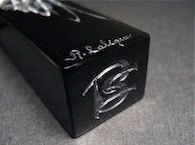 オニキスを思わせるプレス成形の黒ガラスに施されたオリジナルの白パチネが残る。印面は、元所有者のモノグラム(BF?)がインタリオで刻まれている。インタリオ制作は高い技術を要す上に、石や金属製の印面に比べて脆いガラス製シールへの彫刻は、職人の卓越した手彫り技術が要された。ラリックのシール作品で、当時注文で誂えたインタリオが印面にあるものは大変珍しい。