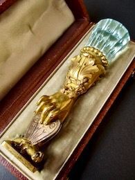 「貴婦人の手首」は19世紀のヨーロッパ芸術におけるセンチメンタリズムを背景に、特にジュエリーの分野で人気の意匠であった。ダイヤモンドと彫金の花飾りをあしらった黄金の袖口から伸びた白く優雅な手首は、ミニアチュール(細密肖像画)つきの腕輪とローズカットダイヤモンドの指輪を着けたヴォリュームある獣牙彫刻である。印面は古代作品を模倣して光沢のない黒いジャスパーに神殿と神々をインタリオで刻んでいる。文房具のような道具ではなくキャビネットに収めて飾る鑑賞用の美術工芸品である。