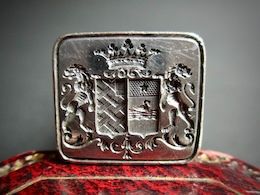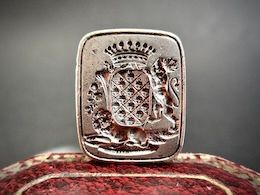 紋章学で、王侯貴族だけに許される王冠を頂いたヘルメットと鹿をアレンジした紋章がインタリオで刻まれている。王冠の意匠から男爵またはバロンの紋章と考えられる。装飾を排した、シンプルで品質の高い作品である。