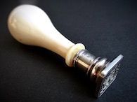 暗緑色に血沫のような赤い斑点模様のブラッドストーンは、磔にされた十字架の下に染み込んだキリストの血が石になったものして絶対的な魔除けの力が宿る神聖な石と伝えられる。そのため家族や自分の紋章や頭文字を彫るシール(印章)に使用されることが多い。卵型のブラッドストーンを銀メッキしたブロンズ細工で装飾したデスクシール。印面は所有者の頭文字L A?と刻まれている。オリジナルケース入り。