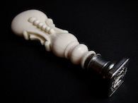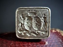 高貴な雰囲気漂うビーズ彫刻を施した扁平獣牙ハンドル。銀製印面に刻んだインタリオはフランス貴族階級で侯爵を示す王冠を戴く紋章である。盾持(サポーター)は左右2頭とも後ろを振り返る(rampant regardant)舌を出した獅子である。水上の白鳥と星の意匠の盾と格子模様フレッティの盾が二つ並んだ紋章は、婚姻により二つの家系が統合されたことを示す。シャンボノー(Chambonneau)侯爵夫人と二人目の夫の紋章と伝えられ、フランス南部ラングドック地方の貴族の家系に由来すると考えられる。