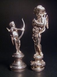 気紛れに恋の矢を放つローマ神話のクピドは、翼をもつ悪戯好きの幼児として表されいつの時代も人々に愛されてきた。弓矢を携え笑みを浮かべる銀製のクピド像2点は、恋人への手紙の押印にふさわしいシールである。矢を手にしてはにかむクピドは、銀無垢の重みがあり彫像として品質が高い。所有者の頭文字E Dと刻まれた印面部分は、取り外し交換可能である。 弓矢を構えたクピドは、印面は何も刻まれておらず未使用である。中空の左足に鋳造時の小さな罅がある。