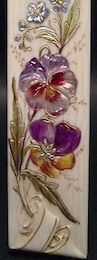 ページターナーを兼ねた木製ペーパーナイフ。湖のほとり、赤い中世風衣装を纏い竪琴を奏でる女と天高く伸びるひなげしの花(虞美人草)、両面の絵柄が違う詩的な趣のエナメル細密画板を嵌め込んだ珍しいハンドルである。エナメル板の上下を銀メッキの植物文レリーフで装飾した手の込んだ工芸品となる。フランスアールヌーヴォー期のリモージュエナメル作品、またはその影響を受けErnestine MillsやAlexander Fisherなどの優れたエナメル作家を輩出した英国アーツアンドクラフツ運動作品と思われる。