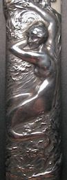松毬はアールヌーヴォー期の作家に好まれた意匠であり、ガレやラリックのガラス作品にも多く用いられた。飴色の水牛の角に松葉の彫刻を施し、握り部分に松毬のブロンズ製レリーフパネルを嵌め込んでいる。