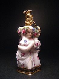 パグ犬を抱く女性の香水瓶は犬の頭が栓となっている。金属製の鎖と犬の首輪はオリジナルである。マイセン王立磁器工場の天才原型師Johann Joachim Kaendler(ヨハン・ヨアヒム・ケンドラー 1706-75)が1761年に制作しロココ趣味の王侯貴族の間で流行したモデルで、19世紀半ばに18世紀の宮廷文化に憧れる貴族や新興ブルジョワによって再び人気を得た。小さく複雑な形の香水瓶は置物のフィギュアと違い、容器内部も形を整え釉薬を掛けた手の込んだ作りとなる。犬の頭と底部に修復あり。