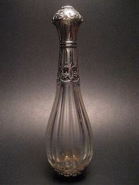 細長い涙滴型のカットガラスの瓶は、花文様の銀の透かし細工でオーバーレイ装飾され、さらに蝶番付きの銀蓋にも花の意匠が打ち出されている。洗練された印象の香水または気付け薬入れである。