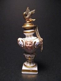 女の顔とブルーの花が交互に浮き彫りされた古代の壺型香水瓶。金属製の鳥の栓は、18世紀後期のエナメル香水瓶に頻繁に使用されたものであるが、マイセンの窯印が19世紀のものであることから、1806年にザクセンが神聖ローマ帝国から独立して王国となってからの作品と推定される。