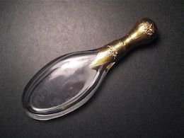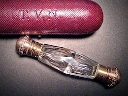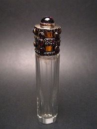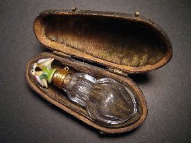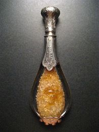 滴型扁壷状のガラス瓶は、グラヴュールが施された銀の蝶番による蓋を開けるとさらに小さなガラスの中栓がつく。現状この栓は固く密閉し開けることができないが、当時の炭酸アンモニウムの結晶の気付け薬入りの貴重な資料である。