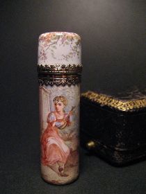 森でリュートを奏でる乙女を容器全体にエナメルで描いた小さな携帯用の香水瓶。鍍金された銀製蝶番のついた蓋を開けると小さなガラスの中栓が現れる。エナメル細工の盛んなリモージュ地方で作られた品を、パリの高級商店街パレロワイヤルに店を構え高級なガラス陶磁器などを扱う G. Boutignyが販売したものである。オリジナル革製ケース入り。