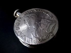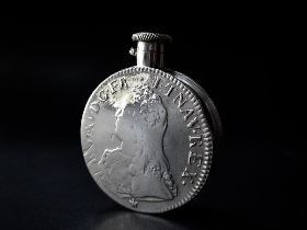 1726年から15年間発行された、ルイ15世16歳の肖像を描いたエキュ銀貨を用いて作った銀製香水瓶。エルメスは古いフランス銀貨を加工した銀製小物を多数制作したが、この作品もそのひとつである。液体が漏れてハンドバッグを汚さぬようネジと蝶番を駆使した密閉度の高い特別仕様。Ravinet d'Enfertは1984年に活動を停止、Ercuis(エルキューイ)に吸収される。貴重なヴィンテージ作品となる。