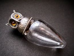 フクロウ(ミミズク)の頭の銀製ネジ蓋つきの逆さ滴型のガラス瓶。蓋内側はコルクが貼られている。カンは無い。小さな瓶の蓋でありながら質の高いフクロウの義眼や羽根表現の精緻さはサンプソン・モーダンの本領が発揮されている。