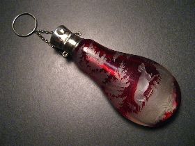 滴型扁壷状のガラス瓶は、ボヘミアンガラスの特徴である「銅赤」と呼ぶ酸化銅によって生成されるルビー色の被せガラスを、グラヴュールで森の中を走る猟犬とウサギを見事に陰刻した作品である。元の所有者Minaの名が刻まれた銀製蝶番の蓋を開けると小さな銅赤ガラスの中栓が現れる。フランス銀刻印から、ボヘミアで制作されたガラスをフランスに輸入し銀細工を施したものと思われる。鹿や風景を彫ったボヘミアンガラスは数多いが、女性を意識したウサギの意匠は珍しい。