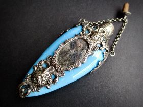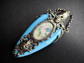 17世紀のヴェネツィアで開発された不透明な乳白色のオパーリングラス、フランスにおいては復古王政期にバカラが製造を始めたことで19世紀に人気を博すようになる。透明感の無いトルコ石のようなガラスに銀メッキのルネサンス風装飾が映える香水瓶である。オリジナルチェーンとコルク栓付きの蓋が残る良い状態(栓はゆるい)。片側のフレームに手描きした花束の細密画、もう一方にミラーが収められている。ロココ文化の18世紀以降、貴婦人にとってフラコンや化粧品、お針道具を綺麗な小袋におさめ身につけることは大切なおしゃれのひとつであった。