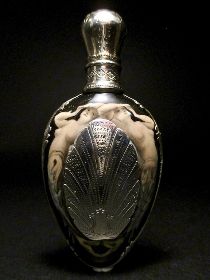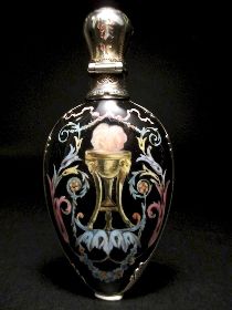 ホタテ貝の形のシルバーオーバーレイ装飾の両脇にふたりの人魚をエナメル絵付けした香水瓶。裏面は古代の香炉をカラフルなルネサンス風装飾で取り囲んだ絵柄である。蓋やオーバーレイ装飾の銀部分は全て手彫りで精緻な模様を刻んでいる。黒い地色の神秘的な雰囲気のエナメル絵付けと銀細工を品良く調和させた、洗練を極めた作品である。