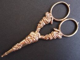 向かい合わせの白鳥の金細工ハンドルと鞘が優雅な手芸用鋏。永遠の愛や忠実を象徴する白鳥モチーフは婚礼の祝いや嫁入り道具であることを示す。鞘があることで、ネセセールなどのケース入り裁縫道具一式から解体されたものではなく元より単独で所有する贅沢品であったと言える。14金の打ち出し(ルプセ細工)から当時18金を好んだフランスやベルギーではなくオーストリア辺りの作品と考えられる。