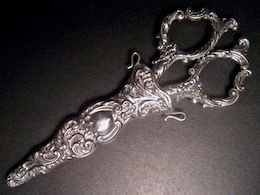 シャトレーヌ用の鞘が付いた、ボタン付けや繕い向けの裁縫鋏である。19世紀後期イギリスでは、上流家庭の女主人に代わり食料庫の鍵や実用道具を、家政婦長がシャトレーヌに付けて着用したため、シンプルなものも多いが、この鋏は渦巻きを多用したロカイユ装飾の銀細工が贅沢な作品である。