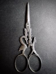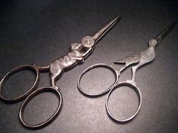 スチールで動物をかたどった手芸鋏二点。猫好きの女性向けの鋏は、鋳造とはいえ猫の顔や体つき、縞模様の毛並みが巧みに表現され状態も良い。コウノトリ型は現代も量産されるが、これは19世紀半ばのもので、鍛金で薄く華奢に仕上げ羽根や足を線彫りしている。ハンドルに一箇所ヒビがあるが、刺繍糸への使用に問題はない。