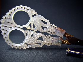 この鋏もそのひとつで、パレロワイヤル作品の特徴である白蝶貝に白鳥や花を刻み星形の透かし彫りを施したハンドルが見事である。永遠の愛や忠実を象徴する白鳥モチーフは婚礼の祝いや嫁入り道具であることを示している。また比較的大きなサイズで、ネセセールなどのケース入り裁縫道具一式から解体されたものではなく元より単独で所有する贅沢品であったと言える。大きく厚い白蝶貝の手彫り感の迫力は、フランス復古王制を象徴する工芸品のひとつと言えよう。