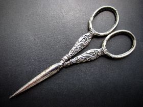 キリスト教以前の古代ケルトの祭司ドルイドが宗教儀式に用いた神聖な植物ヤドリギは、ヨーロッパ、特にアールヌーヴォー期の作家たちに好まれた意匠である。 ヤドリギ文様の細やかなレリーフの銀製ハンドルの手芸鋏。鋭い切先にぐらつきの無い鋏の刃は良好な状態である。