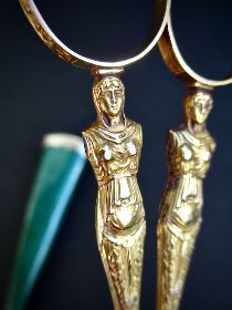 古代ギリシャの神殿建築で梁を支える女像柱をカリアティードと呼ぶ。ヴェールを被る女性像カリアティードハンドルの手芸鋏は、女の顔や衣装のひだなど精巧に作られている。付属するオリジナルの鞘は、ルイ15世の愛妾ポンパドール夫人のお気に入りで王侯貴族の間に広まった、皮革職人Jean-Claude Gallucha(ジャン−クロード・ガルーシャ)が編み出した緑色の鮫皮(実際は鮫ではなくエイの皮)である。18世紀の高級な小間物の多くは緑の鮫皮(彼の名からガルーシャともいう)ケースに納められていたが、現在鮫皮ケースが残存するアンティーク作品は貴重である。