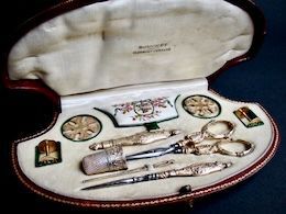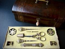 アンティーク作品では紐通し(ボドキン)の欠損や「合わせ」の指貫(シンブル)であるものが多く、完全な一揃いは貴重である。スチール製の鋏や目打ちの刃は僅かな錆が見受けられるが、現在も使用可能である。この様な一式はネセセールと呼ばれ、教養として手芸をたしなむ貴婦人の必需品であった。