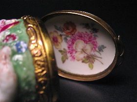 18世紀の英国チェルシー窯の軟質磁器を模した19世紀パリのサムソン工房によるボンボニエール。"A MOY PENSEZ(私を想って)" のメッセージ入りリボンを体に巻いたクピド、蓋の両面は花が手描きされている。