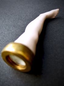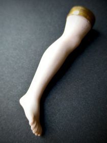 靴も靴下も着けていない少女の脚をかたどったタバティエール(嗅ぎタバコ壜)は、精巧なフィギュアで西洋陶磁の頂点に君臨するマイセン作品である。19世紀ヨーロッパの上流階級において人前で裸足になることは恥辱であり、女性が特別な男性に裸足を見せる行為は性的な意味合いがあった。足指や踵、踝まで繊細に作り込んだエロティックな珍品、欠損してはいるがマイセンのねじ蓋式の壜は蝶番蓋の針入れや栓付き気付け薬入れと比べ稀少である。現状のままコレクションに加えるも良し、ポージーホルダーブローチへ加工しブートニエール(襟に挿す小花)を着用するのも面白い。