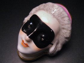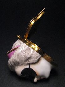 舞踏会で羽目を外しても正体が分からぬよう、黒い仮面を着用したロココ時代の貴婦人を意匠としたボンボニエール。歯を見せて微笑む口元、目蓋からはペーストガラスの目が覗く。オルモル製の蓋には花が刻まれ、タッセルやリボンを通すためのカンが付いている。