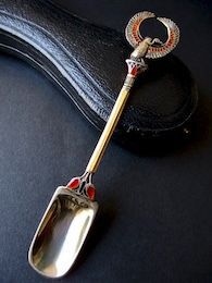 エジプトでツタンカーメン王の墓が発見された1922年の刻印が入った小さめのコーヒースプーン。当時エジプトの発掘品はヨーロッパの芸術家たちに新鮮な驚きと発想を与えアール・デコ様式の流行に多大な影響を与えた。彫金、エナメルともに緻密な細工で仕上げたエジプト神トート(イビス鳥)をモチーフとしたアール・デコ様式のスプーンは、有名工房Levi & Salamanの作品である。スプーン一本のためにオリジナルケースを誂えた最高級品である。