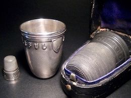 英語 'thimbleful'は、液体、特に酒に使う単語で、指貫一杯分つまり「ほんの少量」の意味である。ヴィクトリア時代「飲み過ぎよ。もう終わりになさい」と注意された酒好きの男性が、「あとシンブル一杯だけ」という場面で取り出すショットグラスが「シンブルフル」で、裁縫道具のシンブルをそのままショットグラスサイズに拡大したカップである。英国らしい洒落のきいたアイテムであるが、ケースまで本物に似せ作られたものは珍しい。ノベルティ(目新しく珍しいの意)の蒐集家だけでなく、シンブルコレクター、ウィスキーなどショット飲みの愛飲家にもお薦めのヴィクトリアン作品である。