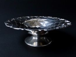 鱗状の花弁を刻んだ小さなコンポート型の器。1775年創業、1897年以降王室御用達を誇る英国銀器を代表するマッピン&ウェッブ作品である。一片ずつ打ち出した花弁の文様、器の外側はその規則的な凹凸に味わいがある。技巧を凝らした小さな器は仏教法具のようでもあり、国や時代を超越した普遍の美を感じさせる。欧米では装飾性の高い脚付きの浅い皿はTazza(タッツァ)と呼ばれ多くは食品の盛り付けにはそぐわないが、この作品は小粒の干菓子などを載せ愉しんでも良い。