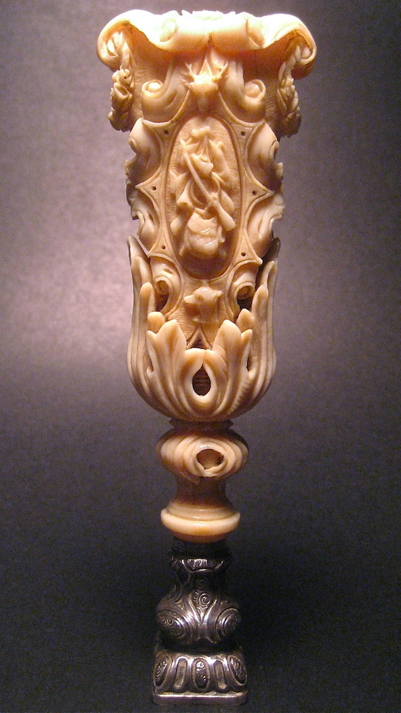 大振りな獣牙のハンドルは、片面に鹿と猟犬の頭部の間に狩猟の戦利品(獲物の野鳥や兎、猟銃、ホルン等)、もう片面に海豚の頭部とホタテ貝の間に漁の戦利品(獲物の魚の束、銛や網等)、さらにそれらを取り巻く花綱や葉飾り装飾を細かく刻んでいる。自然の恵みである獲物は豊穣を表す幸運の象徴である。ハンドル先端は、王冠を頂いた盾(小動物の意匠)と盾持ち一対の犬?の紋章とともに、フランス語で "JE RASSURE" と刻まれている。これは「我、保証す」の意で、この印章で封印することは、即ち所有者本人の書簡であることを保証するものであった。銀製の印面は所有者の頭文字 S K?が飾り文字で刻まれている。ヴォリュームある迫力の逸品。ハンドルくびれ部分に修復あり。