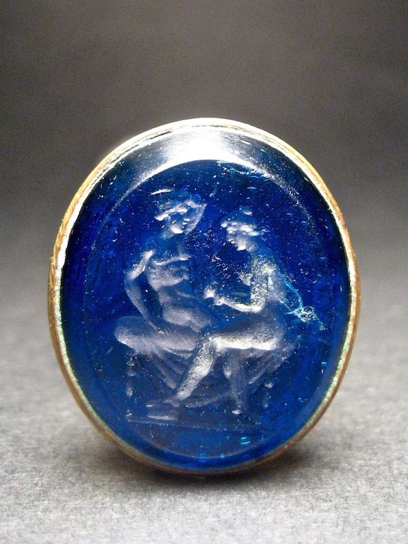 この作品の印面のブルーペーストは18世紀のタッシー作品で、19世紀にハンドルに瑪瑙を使い贅沢なデスクシールに仕立てたものである。女性が男性器を握り足を絡ませた裸の男女は、1771年ナポリで出版された Pierre d’Hancarville著 "Veneres uti observantur in gemmis antiquis”からの意匠である。