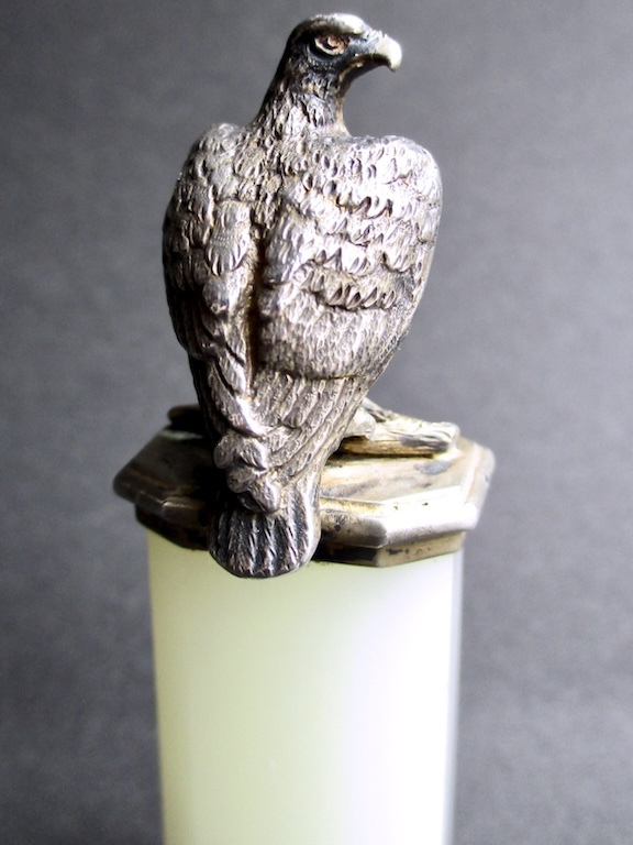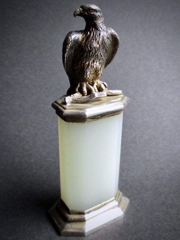 ホワイトオニキスの八角柱に載る眼光鋭い銀の鷲。精密な鷲の羽根や枝を掴む鉤爪はまるで室内装飾用の彫刻を縮小したようなクオリティである。空の王者と呼ばれる鷲は古代より力や勇気などを象徴し、そのイメージは権力者に好まれ国章をはじめ多くの紋章に使用されている。白いオニキスは古くから魔除けとされる。銀の印面は何も刻まれておらず未使用である