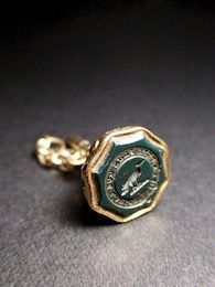 印面のブラッドストーンは洒落た八角形、フランス語で"LA TÊTE PLUS QUE L'ARGENT(お金より頭)"のモットーを記したガーター勲章に囲まれた鳥の姿がインタリオで刻まれている。鳥は知性を象徴するカラス、モットーは日本の諺「知恵は万代の宝」と同じ意味である。ウォッチキーであるためサイズが小さく、単品だけではなく複数でチャームのようにチェーンにつけたい。