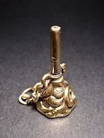 竜頭を使う手巻き式時計より古いタイプの鍵巻き式懐中時計用の小さな鍵とシールを組み合わせたゴールドフォブ。小粒なトルコ石とグラヴィールで細かな模様を施した金細工がアンティークらしい。シールド(盾)形のアメジストの印面は、何も刻まれておらず未使用である。ターコイズブルーとヴァイオレットの組み合わせが女性好みのフォブシール。 ウォッチキーであるためサイズが小さく、単品だけではなく複数でチャームのようにチェーンにつけたい。