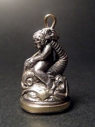 イルカに跨るプットーを銀細工でかたどったフォブシールである。愛嬌ある厚い唇のイルカが可愛らしい。印面は何も刻まれておらず未使用である。