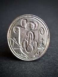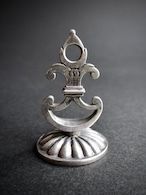 18世紀後期このタイプの銀製フォブシールには刻印が無いことが多く、この作品も銀刻印は無いがフランスまたはオランダ作品と推察される。印面はG Aの頭文字の上に翼を広げた鳥、左右に十字架/髑髏とコンパス/定規のインタリオである。フリーメーソンシンボルに類似しているが詳細は不明。上部のカン近くにもIPI?の文字や意味不明のモチーフのある謎めいたシールである。