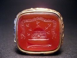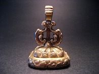 ヴォリュームある金張りのフォブシールである。カーネリアンの印面には「勤勉と達成」を意味する"INDUSTRY AND SPEAD(=SPEED)"の巻紙とともに働きもののミツバチと軍隊で号令に使われるラッパの意匠がインタリオで刻まれている。当時の新興ブルジョワの産業資本家が所有していたと思われる。