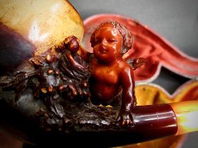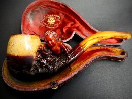 ロシア帝国を示す双頭の鷲の紋章とブランド名ALEXANDREの金の箔押しラベル付き革ケース入りメシャムパイプ。革命により多くの贅沢品が失われた帝政ロシア時代のメシャム彫刻パイプは珍しい。鳥の巣から卵を盗むいたずら天使という主題も変わっている。19世紀後期キリスト教の倫理的な戒律が厳格化したヨーロッパの美術分野ではクピドやプットーなどの子どもの性器は隠す表現が推奨されたが、ロシア製パイプのケルビムは性器があるのが面白い。煙草のヤニで琥珀色に変化するまで育てた(使い込んだ)パイプであるが、ケルビムの顔や翼、手足の指、巣周りの葉などの細密彫刻にダメージは無い。