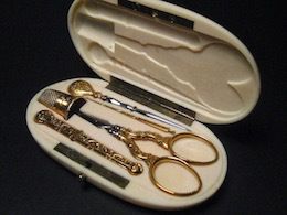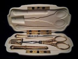 アンティーク作品では紐通し(ボドキン)の欠損や「合わせ」の指貫(シンブル)であるものが多く、完全な一揃いは貴重である。スチール製の鋏や目打ちの刃は僅かな錆が見受けられるが、現在も使用可能である。この様な一式はネセセールと呼ばれ、教養として手芸をたしなむ貴婦人の必需品であった。