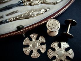 有名作家Janvier Querciaの工房印が全ての道具に銀刻印とともに打刻されている。イタリア出身の彼は19世紀後期にパリで店を構え、アールヌーヴォー様式の宝飾品やステッキの柄や文房具などの高級小物を制作販売した。ボックス内側に、当時この作品を販売した南フランスマルセイユの高級メゾンRacineの押印、メゾンのチケットが残る。