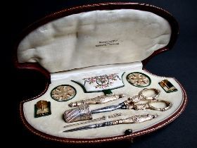 Emile Faivre革製ケース入り鍍金銀製裁縫道具一揃い(ネセセール)