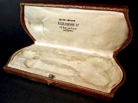 かつてフランス ル・アーブルの高級商店が上等な裁縫道具一式(指貫、鋏、針入れ、紐通し)を収めて販売した、革製の空のエテュイ(ケース)である。上蓋を飾る金の箔押しは、婚礼を表す意匠、花輪の中にリボンで結ばれたクピドの弓矢と二つの花籠で、裕福な若い娘の嫁入り道具として納品されたことを示す。蓋内側に"MAISON FONTAINE A.CHAMPION Sr 117.Rue de Paris LE HAVRE"の押印がある。道具がぴったりと収まるよう窪みをつけたヴェルヴェット。同形の道具をセットで探すことは諦め気に入りの道具を上手に収納またはディスプレイしたい。
