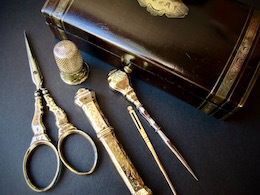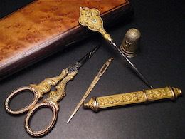 ダークカラーのローズウッドに模様を刻んだ薄い真鍮板を象嵌した(ブール象嵌技法)ケースに納められた、ソーイングセット(指貫、鋏、針入れ、紐通し針、目打ち)である。各道具は葉飾り文様を手彫りした銀に鍍金を施した装飾である。全ての道具が揃いのグラヴュールという見応えのある彫金細工である。アンティーク作品では紐通し(ボドキン)の欠損や「合わせ」の指貫(シンブル)であるものが多く、完全な一揃いは貴重である。