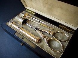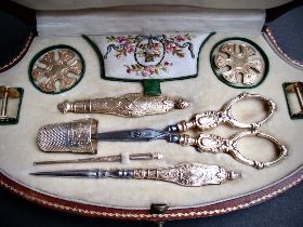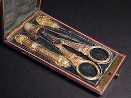 アンティーク作品では紐通し(ボドキン)の欠損や「合わせ」の指貫(シンブル)であるものが多く、完全な一揃いは貴重である。スチール製の鋏や目打ちの刃は僅かな錆が見受けられるが、現在も使用可能である。鋏の下部に鏡が内蔵されている。この様な一式はネセセールと呼ばれ、教養として手芸をたしなむ貴婦人の必需品であった。