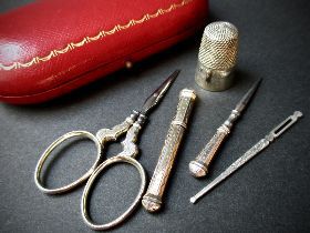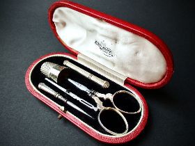Henri Lambin革製ケース入り鍍金銀製裁縫道具一揃い(ネセセール)