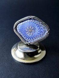 19世紀の上流社会において晩餐会を開き客人をもてなす事は社会的なステータスであり、様々な作法も確立していた。着席者の名前や献立を記したカードを挟んで卓上に置くメニューホルダーは、道具としての食器とは違って主人のセンスを主張できる装飾品としてユニークなものが多い。現代ではお気に入りのカードや写真を飾っても楽しい。旋盤で刻むことで生み出される模様(ギョーシェ)が透けて見えるよう透明感のあるコーンフラワー・ブルーのエナメルを上から施したギョーシェエナメルと細かい金の装飾文様がエレガントなメニューホルダー。パリのエナメル職人Charlot Frèreの作品である。