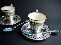 Frank M. Whitingによるこの作品は数ある銀製ホルダーとソーサーの中で群を抜いて美しく花紋様の透かし細工が見事である。濃いコーヒーを白いカップに注ぎ流麗な銀装飾を愛でる時間を楽しみたい。色のあるエナメルスプーンが調和する。