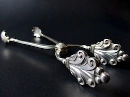 ジョージ・ジェンセンのためにヨハン・ロード(1856-1935)が1917年にデザインした「アカンサス(別名ドロンニン)」シリーズは、長きにわたり定番商品であったが2004年製造終了となった。シュガートングと比べて大きなサイズのアイストング(型番284)はずっしりした銀の重量感が手に心地良い。十分に厚みのある摘み部分の両面に施した、凹凸がくっきりした「アカンサス」モチーフは大変迫力がある。20世紀半ばの作品であるが、現在は製造販売されておらず貴重となる。